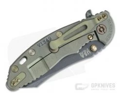 Handle: Â Full titanium frame lock and liner have a matching Battle Green Finish (anodized green Working Finish) that is rugged and hides wear well while having a classic visual appeal when paired with the handsome Textured Walnut scale. Bronze Hardware and standoffs create one solid, easy to maintain package. A forward choil, strategically placed jimping and an ergonomic handle design delivers security and control in the hand. Includes the Hinderer Lockbar Stabilizer for added performance. S/N V1349.