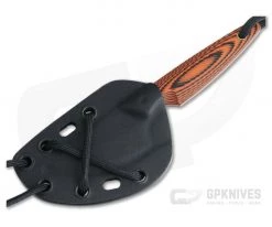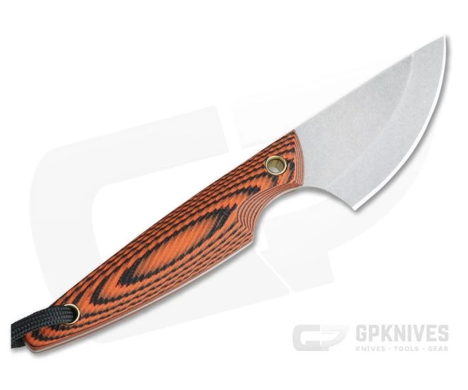The Smith & Sons Shrew is a fully functional, every day carry fixed blade designed for neck carry. The slender handle design makes for low-profile carry while still providing a full, four-finger grip. A compact blade of AEB-L offers a full belly, hollow ground cutting edge and fine point ideal for everyday use. At 3.5 oz (132.3 g) for the whole package you’ll forget you’ve got it until you need it. This version comes with a tumbled blade finish and Orange/Black layered G10 handle scales.