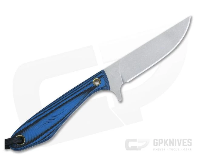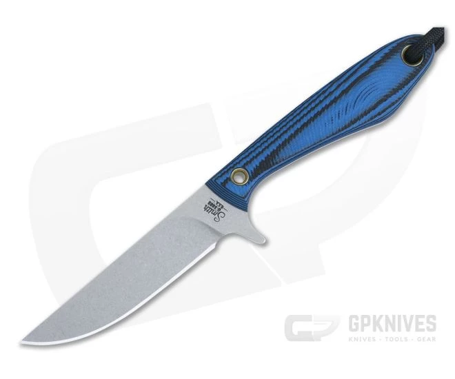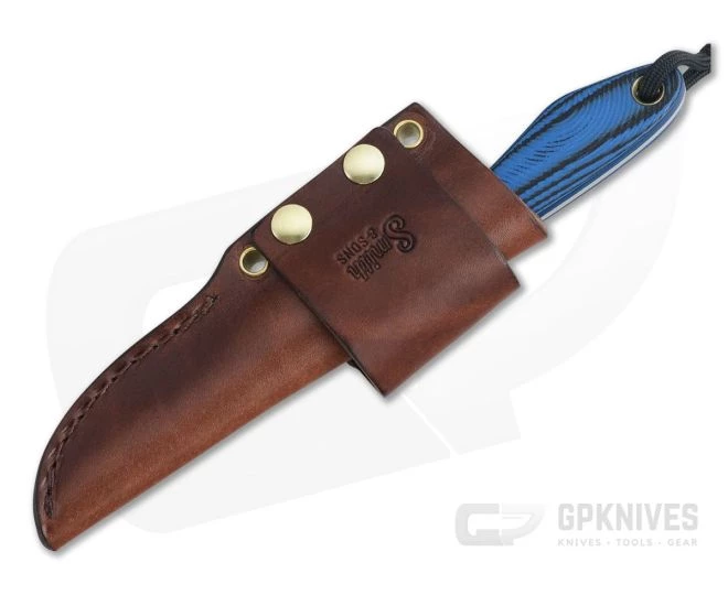 Handle:Â Layered Blue & Black G10 scales are supported by the full tang construction and paired with the pommel swell handle design gives this small knife a big in hand feel. Doppler milled textured on the handles adds traction and offers an appealing style. The Spur is comfortable enough for serious, extended use. Dual flared brass pins hold the scales securely and provide attachment points for lashing or lanyards, one of which is included at the pommel end which helps to draw the knife from the sheath.
