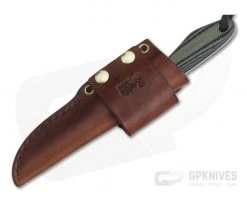 Handle:Â Layered Camo (OD Green and Black) G10 scales are supported by the full tang construction and paired with the pommel swell handle design gives this small knife a big in hand feel. Doppler milled textured on the handles adds traction and offers an appealing style. The Spur is comfortable enough for serious, extended use. Dual flared brass pins hold the scales securely and provide attachment points for lashing or lanyards, one of which is included at the pommel end which helps to draw the knife from the sheath.