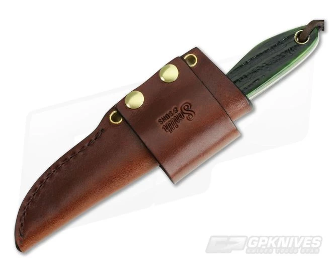 Handle:Â Rugged Green Jigged Bone scales are supported by the full tang construction and paired with the pommel swell handle design gives this small knife a big in hand feel. The Spur is comfortable enough for serious, extended use. Dual flared brass pins hold the scales securely and provide attachment points for lashing or lanyards, one of which is included at the pommel end which helps to draw the knife from the sheath.