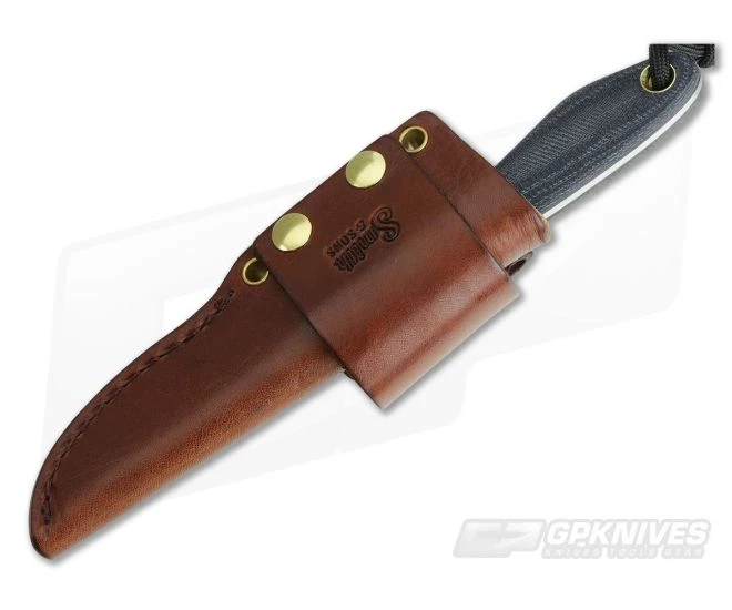 Handle:Â Tough yet comfortable Blue Denim Canvas Micarta scales from Shadetree Custom Composites are supported by the full tang construction and paired with the pommel swell handle design gives this small knife a big in hand feel. The Spur is comfortable enough for serious, extended use. Dual flared brass pins hold the scales securely and provide attachment points for lashing or lanyards, one of which is included at the pommel end which helps to draw the knife from the sheath.