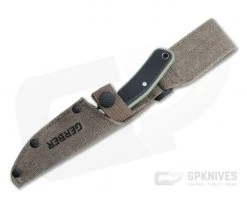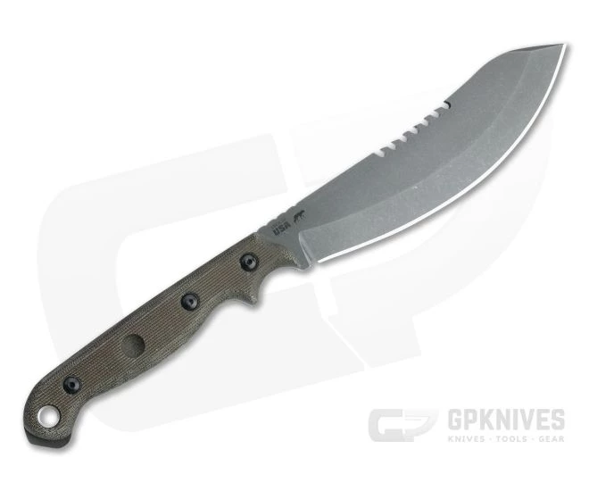Handle: The thick, contoured green canvas Micarta handle scales offer a secure grip even when wet. The extra long handle has two index choils, a generous palm swell and pronounced pommel end giving multiple grip options for versatility in use. An exposed pommel end can be used as an impact tool while divots on the scales can be used in bow drill fire making. A hollow tube allows for lanyard attachment.