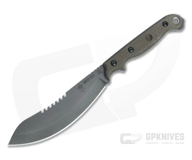 Designed by Nate and Aaron Morgan, some TOPS fans with lots of outdoor field experience, the Brush Wolf is a Nessmuk inspired outdoor field knife that can handle lots of different roles effectively. An extra long handle offers multiple grip options and leverage when swinging while the blade is robust and designed to tackle a variety of outdoor cutting tasks. This version comes with a blade of Acid Rain finished 1095 carbon steel and green canvas Micarta handle scales.